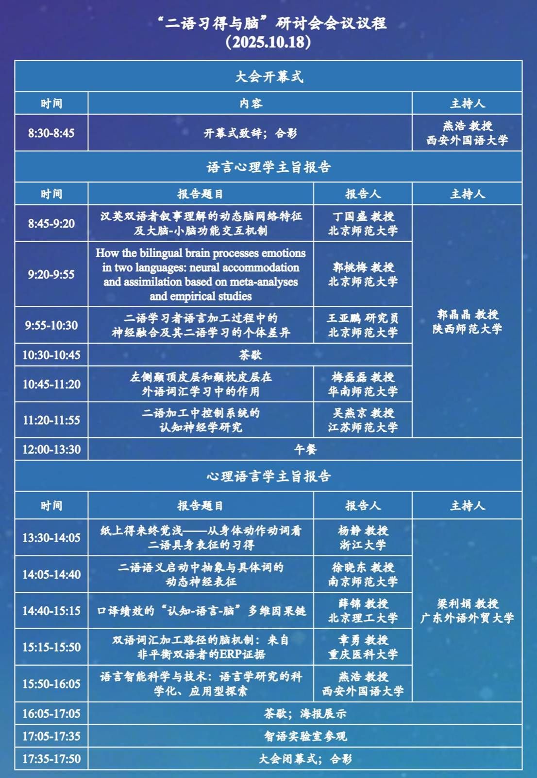 本次研讨会将采用线下形式举行,通过专家主旨报告、海报交流、实验室参观及技术演示等环节,为与会者提供学术探讨与合作交流的平台。我们诚挚邀请国内外高校、科研院所、医疗机构及产业界的专家学者、研究人员、教师、博硕士研究生及优秀本科生莅临西安外国语大学长安校区,共同探讨二语习得与脑科学的前沿进展,推动跨学科创新与产学研融合。