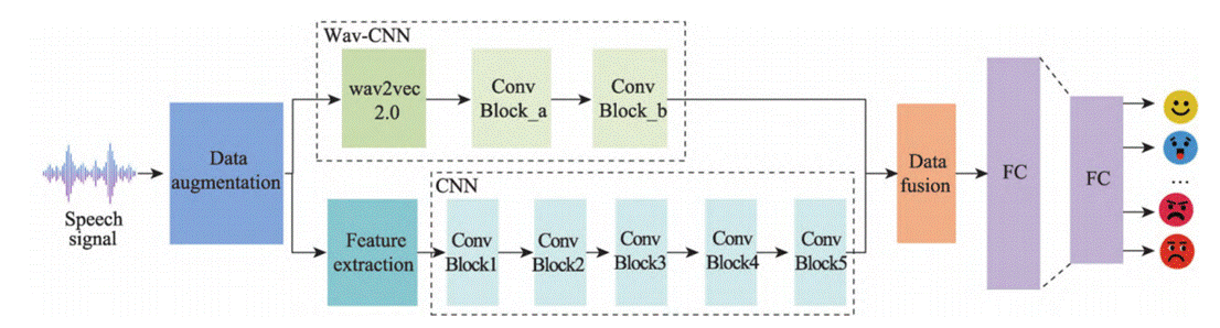 注:这张图展示了AI的“情感双通道”:左侧进行数据增强;中间两个并行通道分别用Wav2vec 2.0和CNN提取语音数据的深层表征和浅层表征;最后像“情感调音师”一样把深浅特征融合,让AI识别你的真实情绪。