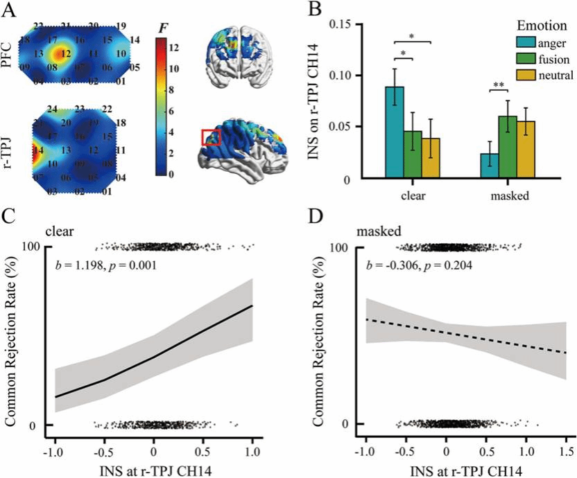 注:先给大脑 “地图” 标好关键位置—— 右侧颞顶联合区(r-TPJ)(图 A)。等清晰甩愤怒脸时,它的 “脑电波同步值”(INS)直接飙高(图 B);表情明明白白的话,这同步值还能预判 “集体拒绝率”,但表情一被挡,这预判技能直接失灵(图 C-D)。