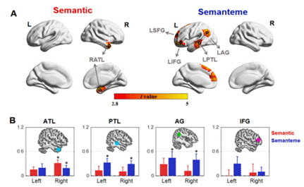 注:这张图就像“大脑的语言加工竞赛现场直播”——左边是“语义整合”赛道,只有右侧颞叶前部(RATL)在默默干活,右边是“义素整合”赛道,却是“全脑总动员”:颞叶前部、颞叶后部、角回、额下回……全都亮了起来。