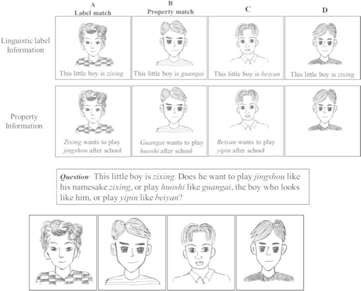 注:这是实验给娃出的“认亲选择题”:左边三个小人儿,一个只同名不同貌(标签匹配)、一个只同貌不同名(属性匹配)、还有一个纯属路人(干扰项),娃得回答 “新来的这个人,到底是跟同名的那个玩,还是跟撞脸的那个玩”。这简直是一道精准的 “灵魂拷问”:在孩子的世界里,交朋友到底是“认名字”还是“认脸”?