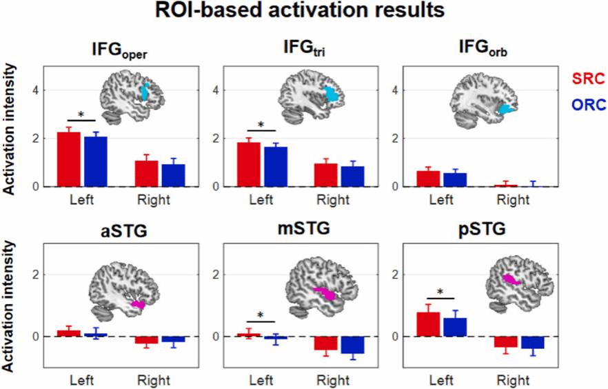 注:这是大脑的“工作强度指示器”:红色(主语从句)让左脑前额叶和颞叶多个子区域“加班”点亮;蓝色(宾语从句)则让它们轻松不少。大脑处理复杂句子时,就像同时开了“语言专属”和“通用内存”两个后台程序,忙得不亦乐乎。
