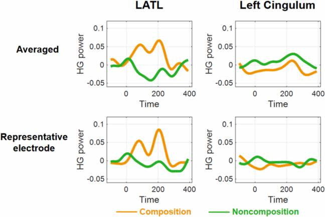 想看看左侧颞叶前部(LATL)在组合两个词(比如“红船”)时是不是真在干活?之前用脑磁图(MEG)看“读”词时它挺活跃,但用颅内电极(iEEG)听“听”词时它却“装睡”。这回研究者直接让癫痫患者用iEEG“读”词,结果抓了个正着:LATL在整合词汇语义时(约125毫秒)高频伽马波明显更强!看来这个脑区确实是个“组合器”,但它的表现可能取决于你是“看”还是“听”指令。这提示刺激模态(视觉vs听觉)可能是关键,未来得让iEEG也比比“视听差异”。