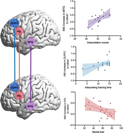 文献实锤口译相关脑区的 “小脾气”:口译分数越高,左MTG的INS越给力;训练时长越久,左DLPFC的同步性越在线;心理负荷一超标,左IFG的INS 直接 “躺平”,这神经同步规律藏都藏不住~